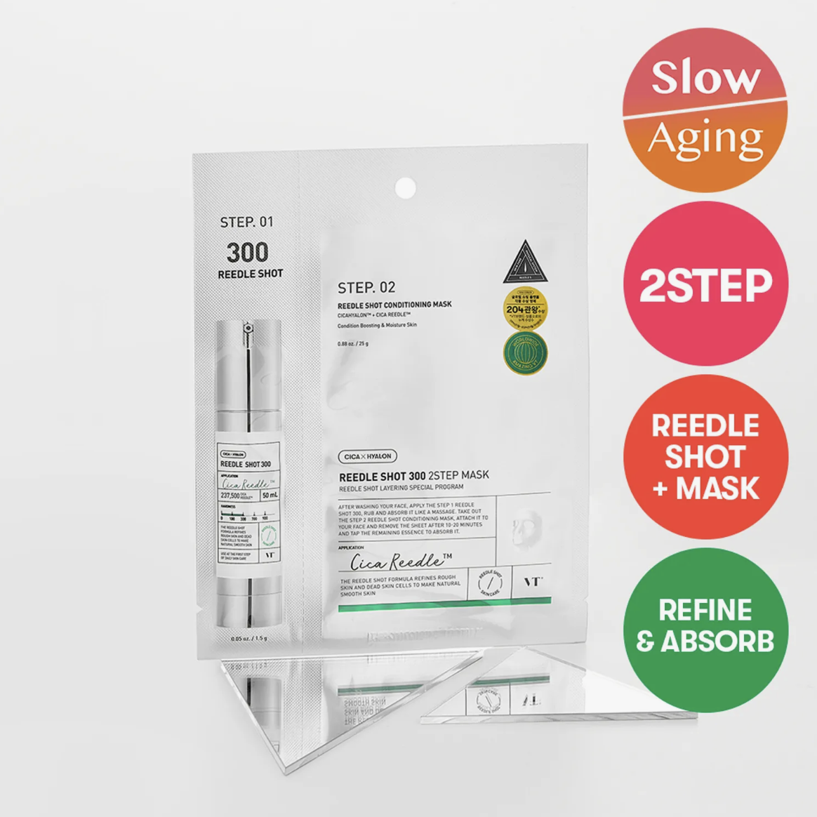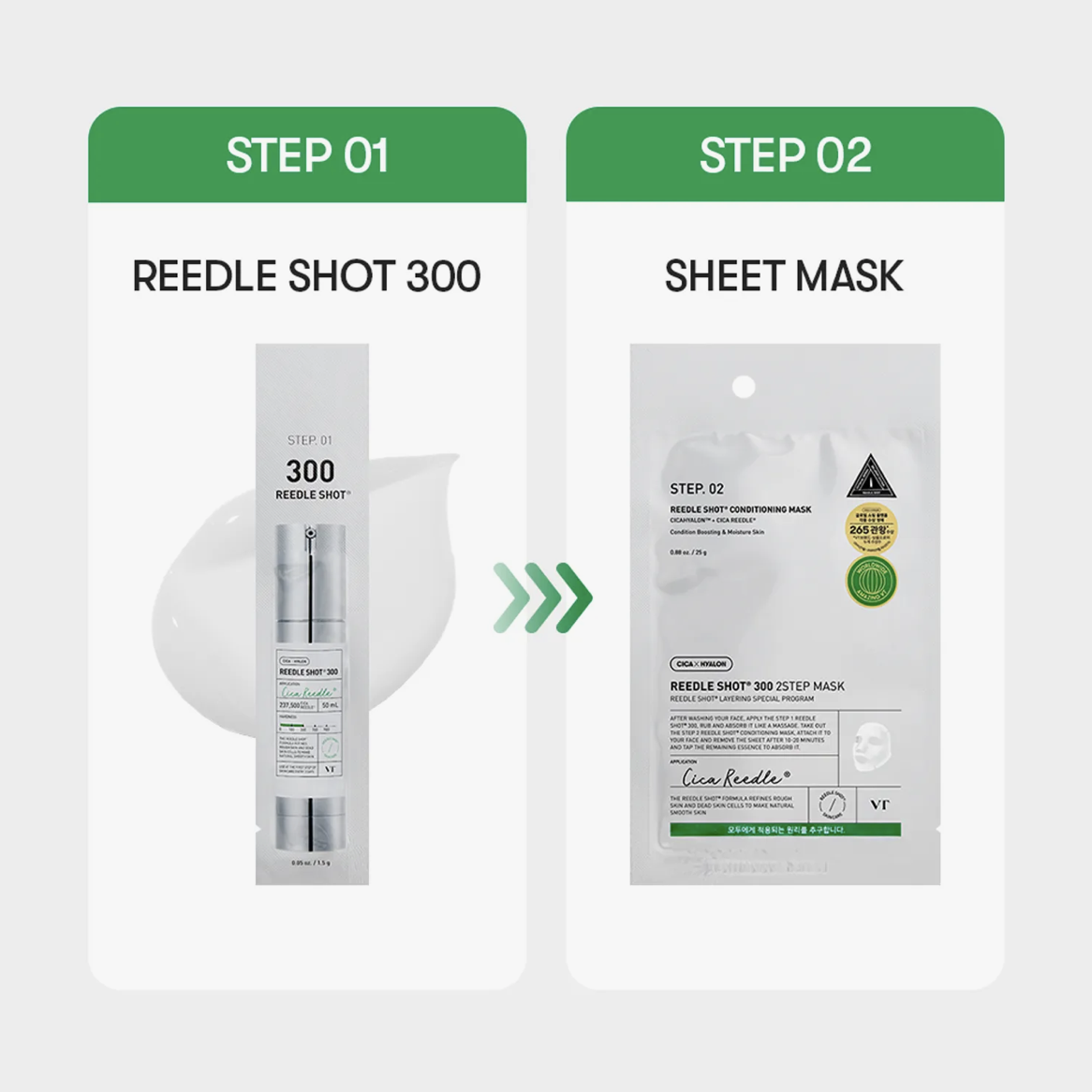 Verfeinere deine Hauttextur und minimiere vergrößerte Poren mit der VT Cosmetics Reedle Shot 300 2-Step Maske, einer innovativen Zwei-Schritt-Behandlung zur Förderung der Wirkstoffaufnahme und zur Regulierung der Hautfeuchtigkeit.